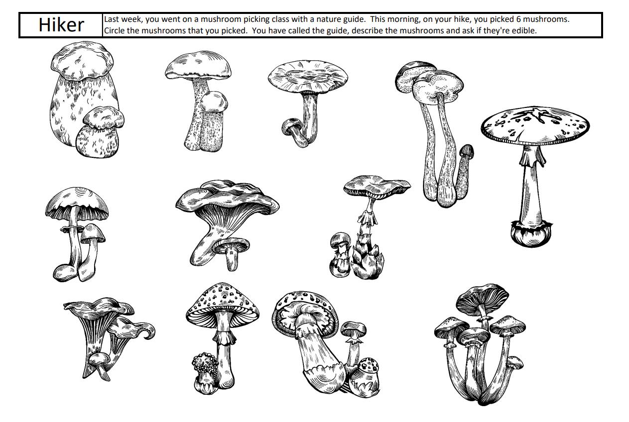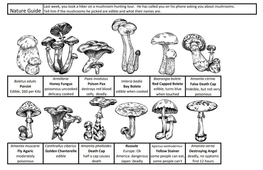 Preteach: cap, gills, collar, frilly, stalk, wavy, squiggly, edible, delicacy, “also known as”, symptoms.